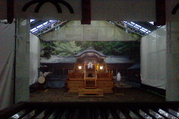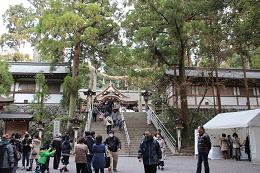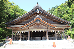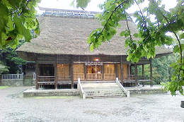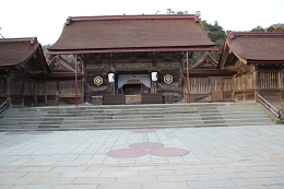 | 最後にオオクニヌシへ子供たちは逆らわないと答えたことを告げるとオオクニヌシは百八十もいる子どもの神たちは、コトシロヌシを先頭にお仕えいたしますので、天の神のお子様に逆らうものはいないでしょうと答えた。その見返りとしてタケミカヅチたちは、オオクニヌシのために、出雲の国の多芸志の小浜に出雲大社※⑧を造りオオクニヌシはその中へ隠れた。 |