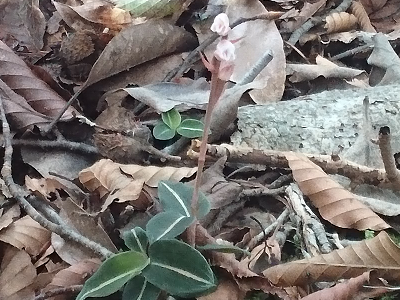 山地樹林下に生える常緑多年草です。唇弁が少し出ているのと葉の中心に白い筋が入っているのが特徴です。山口県ではレッドデータブックの植物です。別名びろうどらんとも呼ばれています。