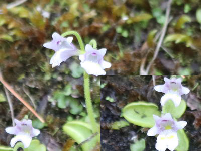 栃木県の庚申山、男体山、女峰山。群馬県の袈裟丸山でしか確認できていない食虫植物で世界的にも希少植物です。タヌキモ科ムシトリスミレ属で多年草です。葉の粘着液で虫を捕獲するようです。(写真、右)