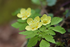 他のシロカネソウ属の葉に比べて柔らかく花枝を取り巻くようにあります。萼片には模様はなく黄色です。